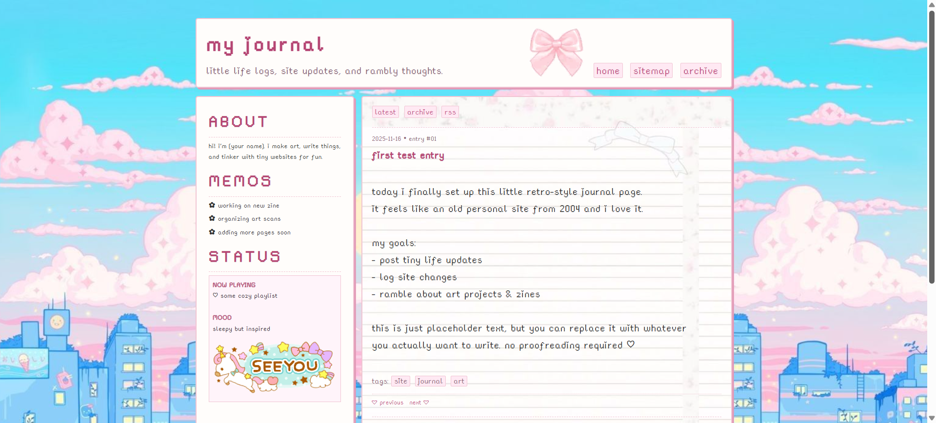 This is a Retro Kawaii Website Template made with HTML and embedded CSS code. You will receive a doc file where you can copy and paste the code. You can use it for neocities, nekoweb, or your own personal coded website. IT IS ONLY ONE PAGE! All images are adjustable and can be linked to any other page that you create. If you dont have word to open the file, open it with google docs/google drive.