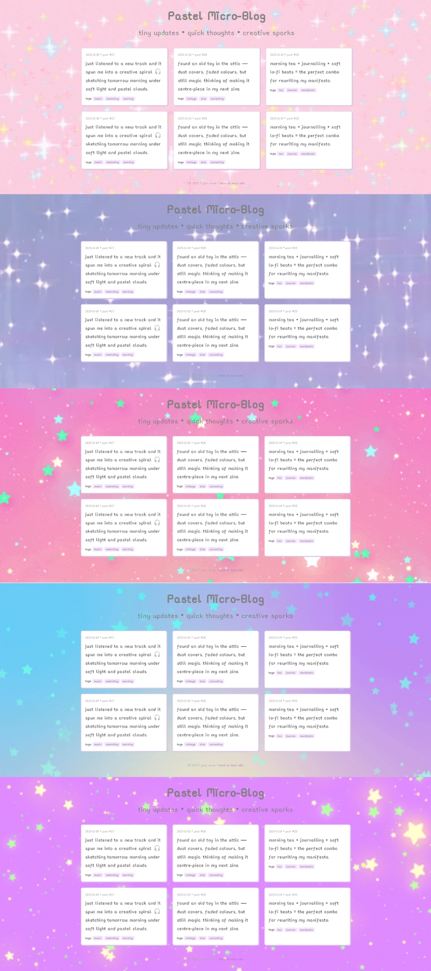 This is a Kawaii Micro-blog Website Template made with HTML and embedded CSS code. You will receive a doc file where you can copy and paste the code. You can use it for neocities, nekoweb, or your own personal coded website. IT IS ONLY ONE PAGE! All images are adjustable and can be linked to any other page that you create. All of the background options are gifs. You will receive access to all of the possible backgrounds that you can add and adjust yourself If you dont have word to open the document file of the code, open it with google docs/google drive.